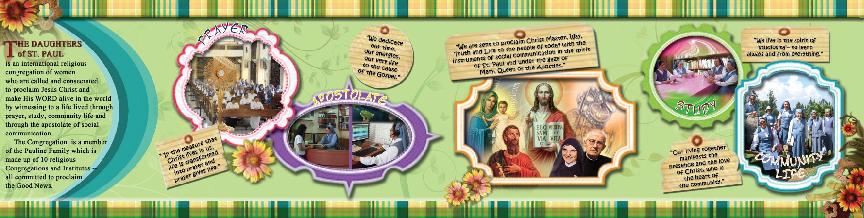 Ang grasya sa pagsugod sa kongregasyon nag-awhag kanamo sa kinasingkasing pagbasa pag-usab sa mga panig-ingnang kasinatian sa among mga madre kinsa mihalad sa ilang kinabuhi alang sa Ebanghelyo. Ang nagtukod sa among kongregasyon miingon: