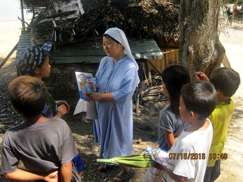 Sr. Wang gathered them near the sea and told them a Bible story. “I showed them the colorful pictures in the book which interested them. I was glad to teach them. There was this family, with 13 siblings in which the eldest at 16 takes good care of her siblings, while their parents are at work. Their house made up of bamboo is near the sea. The eldest washes all their clothes, then gets so tired. These children do not know how to pray.”