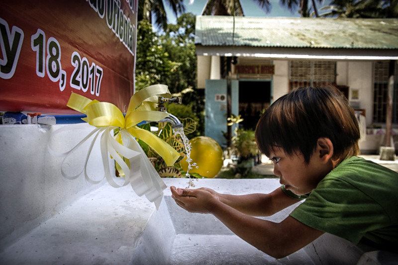 A grade-school student drinking water from the faucet of the new potable water system. (Photo by Eden Jhan Licayan | Mati)