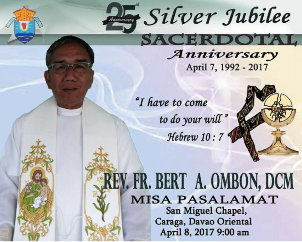 MATI CITY – Tulo ka mga pari sa diyosesis sa Mati ang nagsaulog sa nagkadaiyang mga kasumaran sa pagkapari. Una si Apostolic Administrator Msgr. Edito “Ed” S. Baño, kinsa nagsaulog sa ika-31 ka tuig sa iyang pagkapari niadtong Abril 2, 2017. Sunod sila si Fr. Roberto “Bert” S. Ombon, kura paroko sa Sto. Niño parish, Kinablangan, Baganga, Davao Oriental (DavOr), ug Fr. Roland F. Sayman, parochial vicar sa San Ignacio de Loyola Parish sa Luzon, Gov. Generoso, DavOr, sa ilang ika-25 ka tuig niadtong Abril 7, 2017.