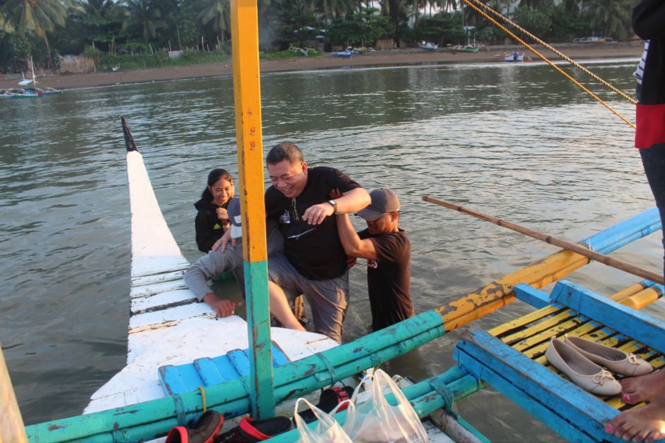 Tungod kay hunas, gibana banaang kinse ka metros ang among gibaktas padulong sa Bangka tungod kay dili makadunggo sa baybay ang Bangka. Makita sa hulagway si Fr. Bong Lunas nga gitabangan pagpasaka aron makasakay sa bangka. Makita usab nga ang mitabang kaniya, anaa na sa hawakan ang tubig sa dagat.